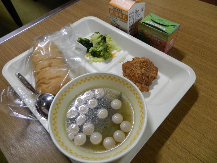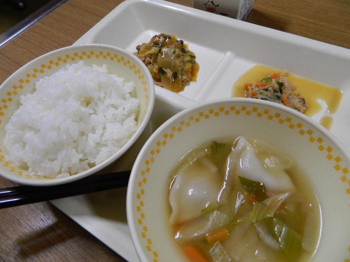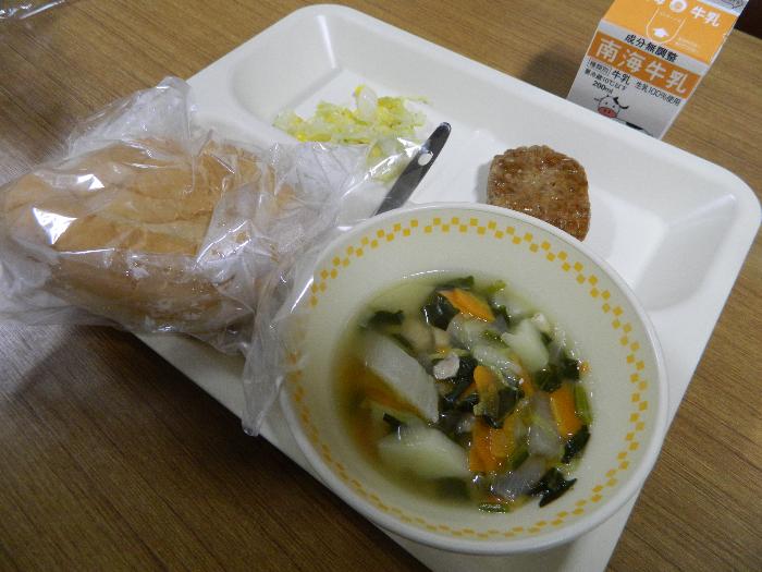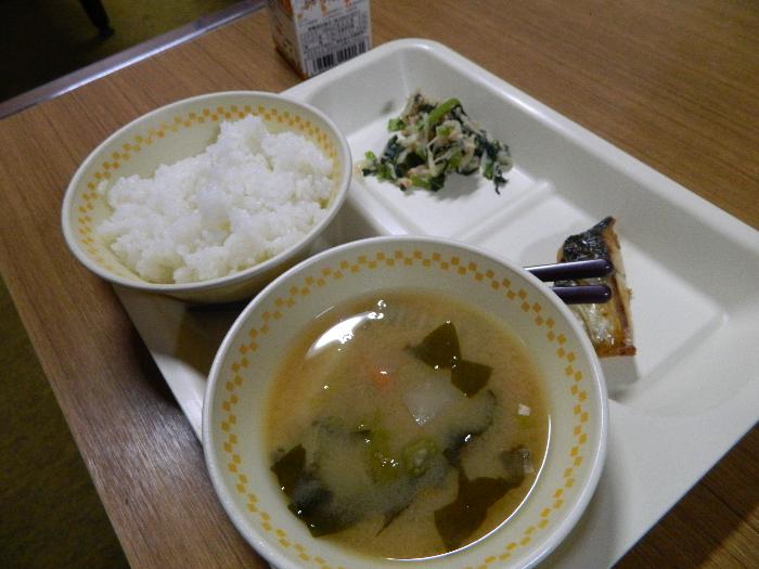 今日のみそ汁には、冬が旬の、かぶ、白菜、里芋が入っています。これらの野菜は、この時期が一番栄養価も高く、甘みや水分も増し、味もおいしくなります。寒さも厳しくなってきたので、温かいみそ汁を食べて、体を温めましょう。