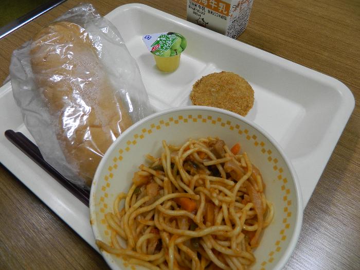 牛乳 パン なすとベーコンのトマトスパゲティ かぼちゃコロッケ 一口ゼリー(洋梨)