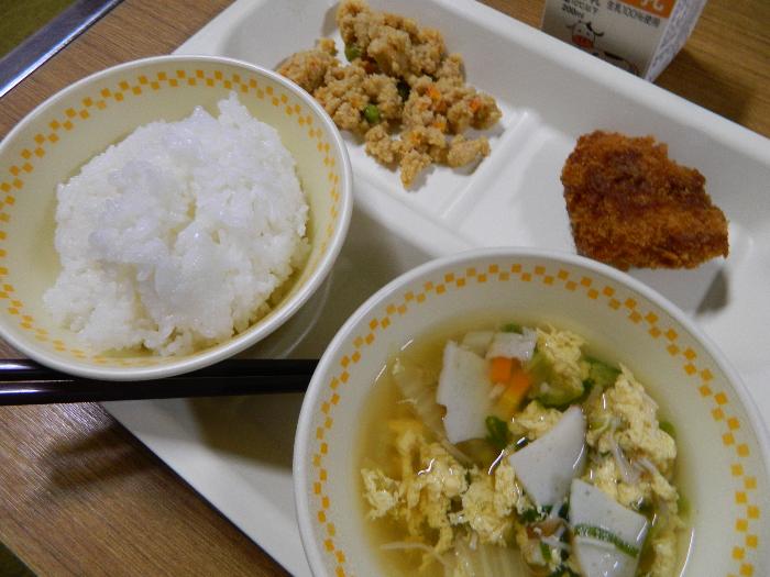 牛乳 鶏そぼろごはん 白身魚フライ かきたま汁