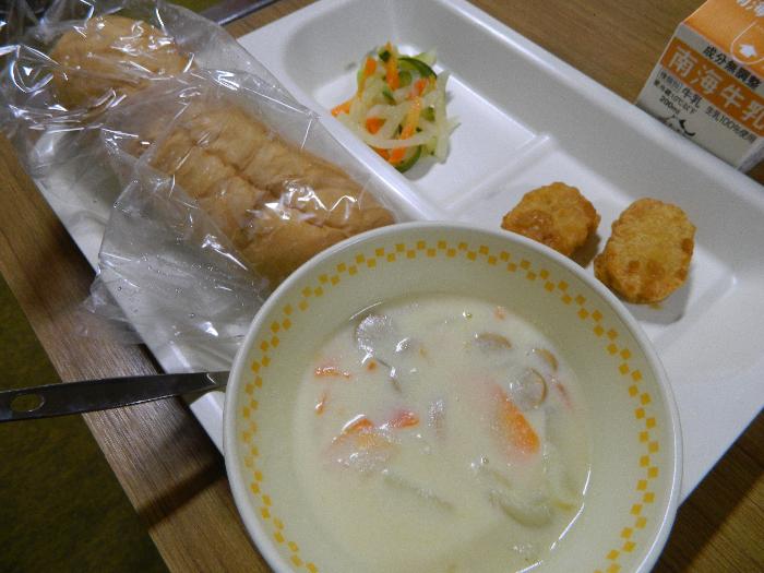 牛乳 パン ビーンズポタージュ チキンナゲットの照り焼きソースかけ 大根サラダ