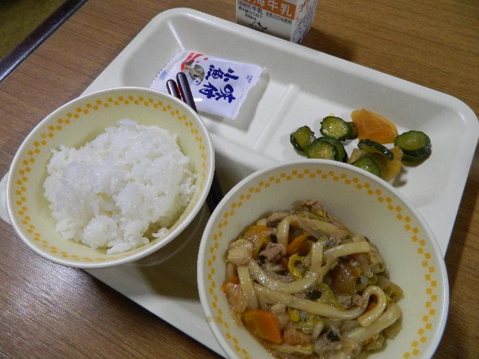 牛乳 ごはん すき焼き風うどん きゅうりと大根のさっぱりづけ ミニフィッシュ