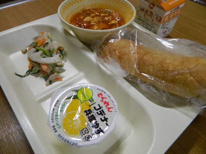 牛乳 アップルパン かぼちゃ入りミネストローネ れんこんサラダ デザート(ゆずゼリー)