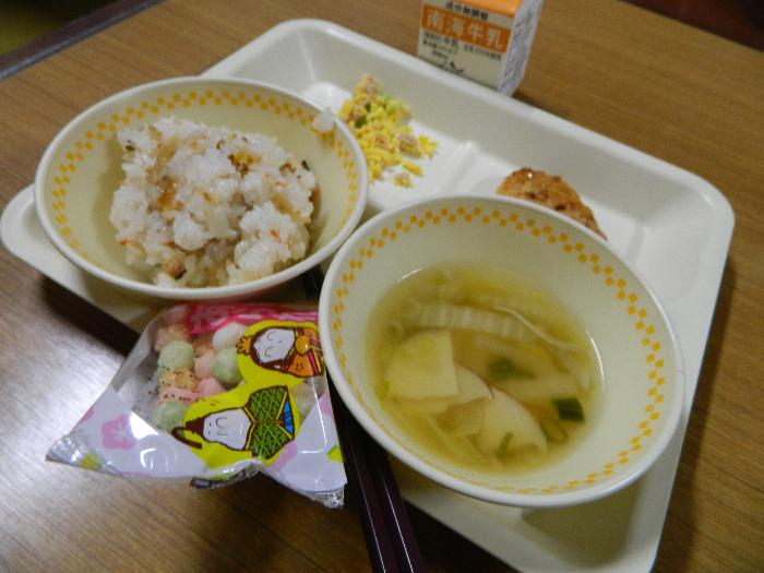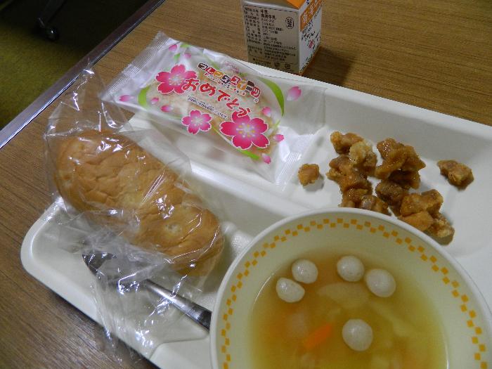 6年生 のみなさん、今日 は、小学校生活最後 の給食 です。今日 は、6年生 の卒業 をお祝 いした献立 です。6年間 の思 い出 を振 り返 りながら、楽 しんで食 べてくださいね。そして、これからも、食 べることを大切 にし、健康 な心 や体 を育 んでください。