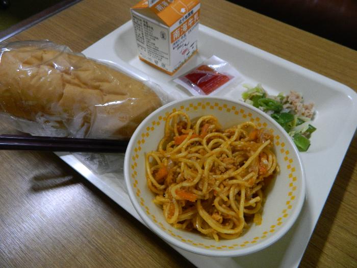 牛乳 パン ミートスパゲティ スナップえんどうのサラダ いちごジャム