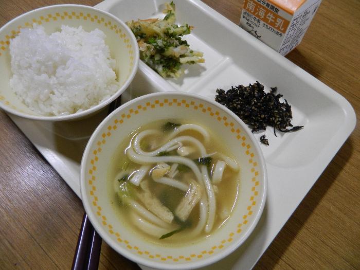 牛乳 ごはん 五目 うどん 菜 の花 のかき揚 げ 手作 りごまひじきふりかけ