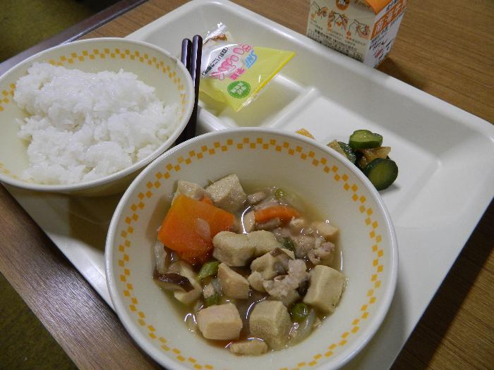 牛乳 ごはん 高野豆腐 の煮物 きゅうりと大根 のさっぱりづけ 豆乳大福