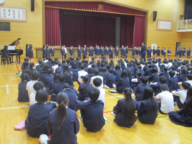 音楽会壮行会(11月4日) Tweet 更新日:2025年11月05日 11月の児童朝礼と市内連合音楽会の壮行会がありました。 連合音楽会は今年は3年生が出場します。曲は「気球に乗ってどこまでも」です。全校児童の前で披露した歌声は、とっても上手でした。 6日が本番です。がんばってください!