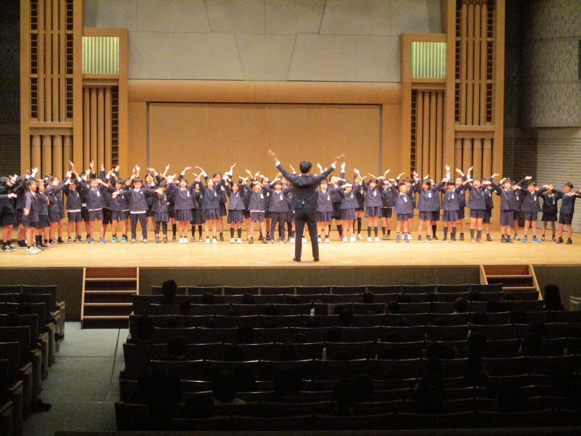 連合音楽会(11月6日) Tweet 更新日:2025年11月06日 泉の森ホールで、泉佐野市の小学校が集まって、連合音楽会が行われました。第一小学校からは3年生が出場しました。 全員で「さんぽ」を歌った後、プログラムに沿って各校が順に歌いました。そしていよいよ第一小学校の出番です。曲は「気球に乗ってどこまでも」。昔からある曲ですが、歌詞がとても素敵で、歌っても聴いても元気になれる曲です。 3年生は今までたくさん練習してきましたが、今日の本番が一番上手でした。とってもすばらしい歌声でした。