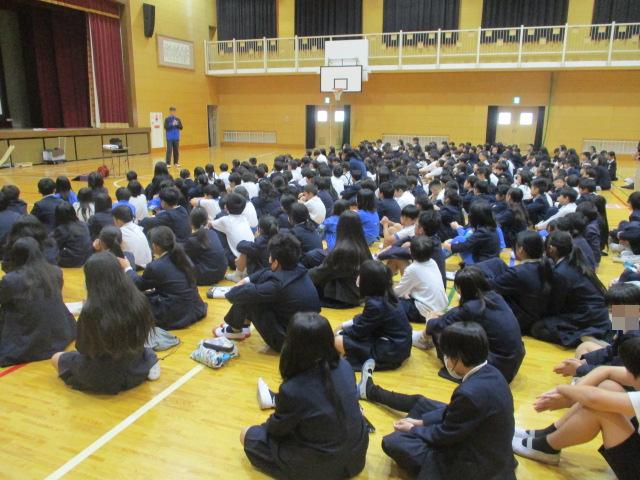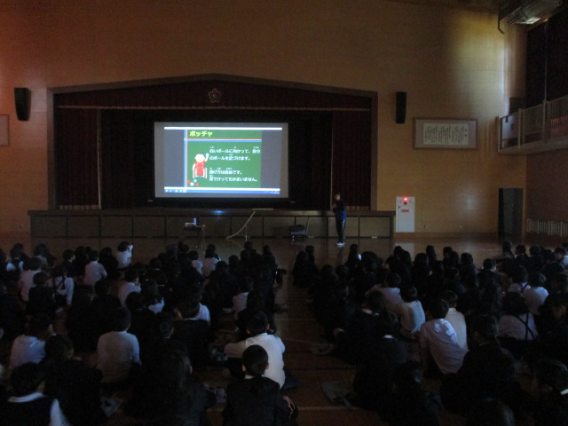 大阪体育大学の先生に来ていただいて、全校でボッチャの講習会を行いました。