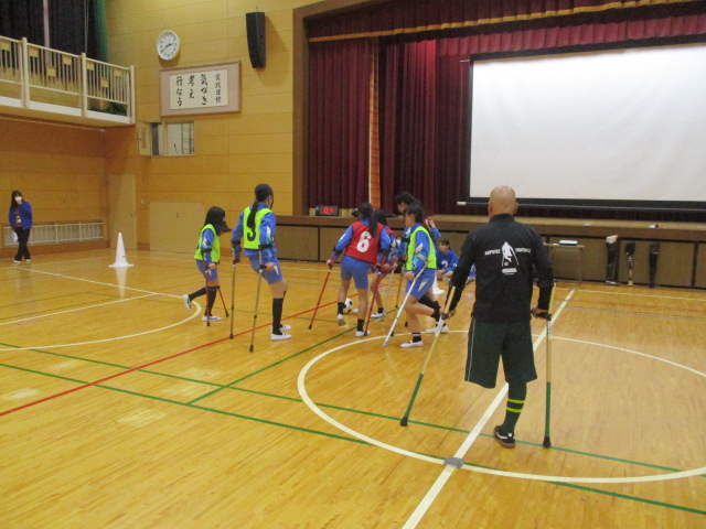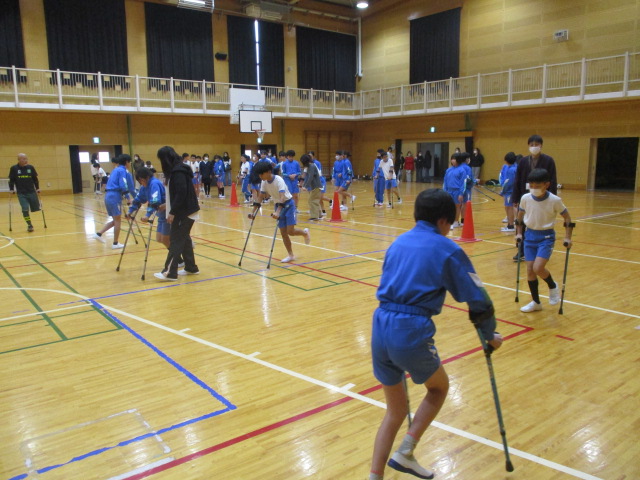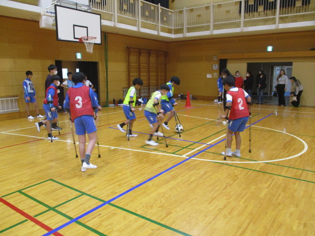 6年生アンプティ・サッカー(11月27日) Tweet 更新日:2025年11月28日 アンプティ・サッカーの元日本代表である川合さんに来ていただき、指導していただきました。普段は義足で生活されていますが、サッカーの時はクラッチ(杖)を使ってプレーされます。 義足で生活されている方のお話を伺う貴重な機会となりました。 アンプティ・サッカーのことやご自身のことなどをお話ししてくださいました。 まずは、クラッチに慣れます。 実際にサッカーボールを使ってプレーしました。 やはり、なかなか難しいですね。