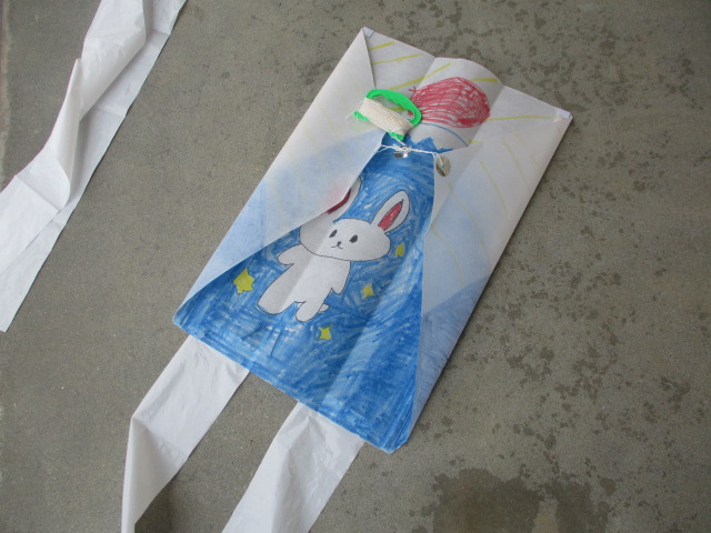 学校では、糸をいっぱいまで伸ばすことができませんでした。持って帰ったら広いところで、思う存分、高くたこをあげてください!