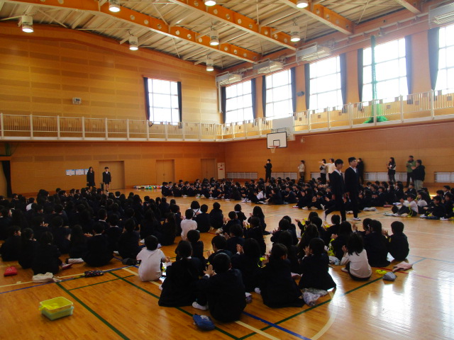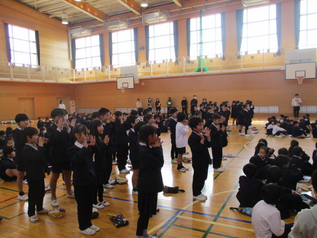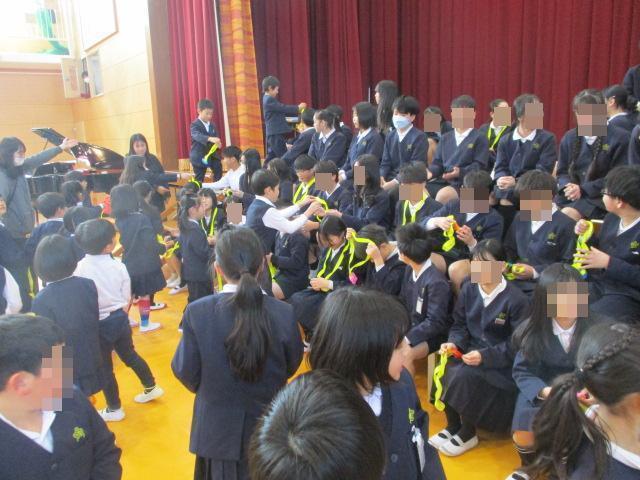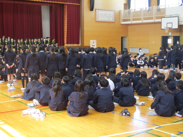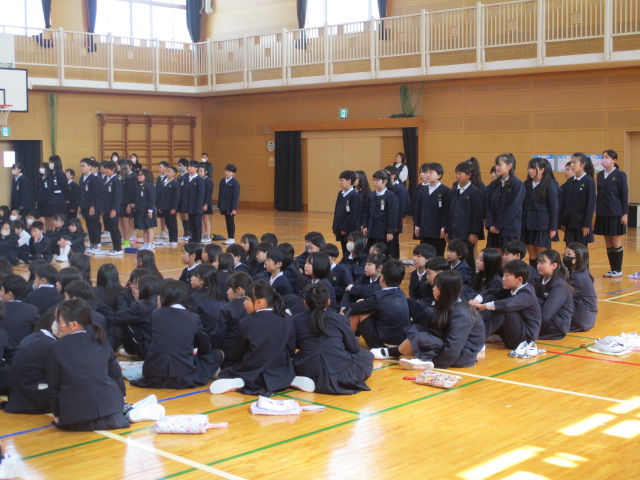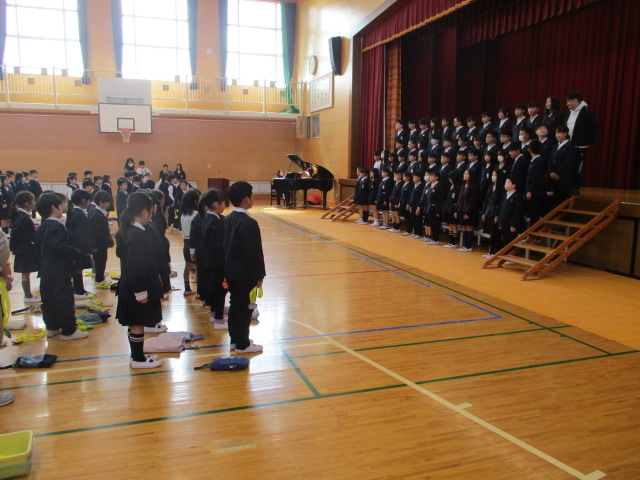 明日の卒業式には1~4年生は参加しませんので、6年生とはこの日が最後になります。各学年がそれぞれ6年生に感謝の気持ちを伝えました。1年生からはメダルのプレゼント、2・3・4年生は気持ちを込めて歌を歌いました。