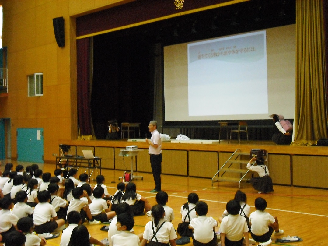 登下校時や校内で地震に遭遇したら、どう身を守るか?吉田アドバイザーの実体験に基づくお話はとても説得力がありました。どの児童も真剣に聞き入っていました。平素から「しっかりと備えておく!」という言葉が印象に残りました。