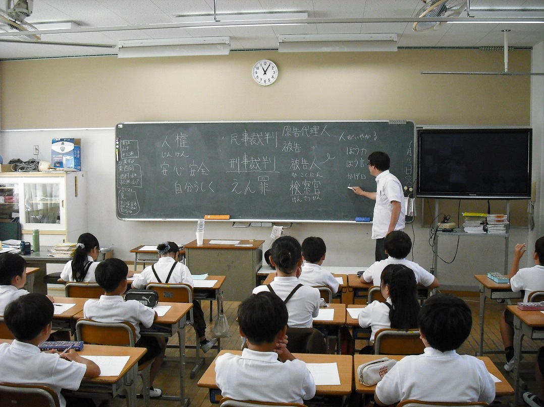 9月16日3時間目に大阪弁護士会いじめ予防出張授業プロジェクトチームより3人の弁護士さんが来校され、4年生向けにクラスごとに出前授業をして頂きました。授業では弁護士の仕事や裁判の種類など法律に関することも色々と教わりました。