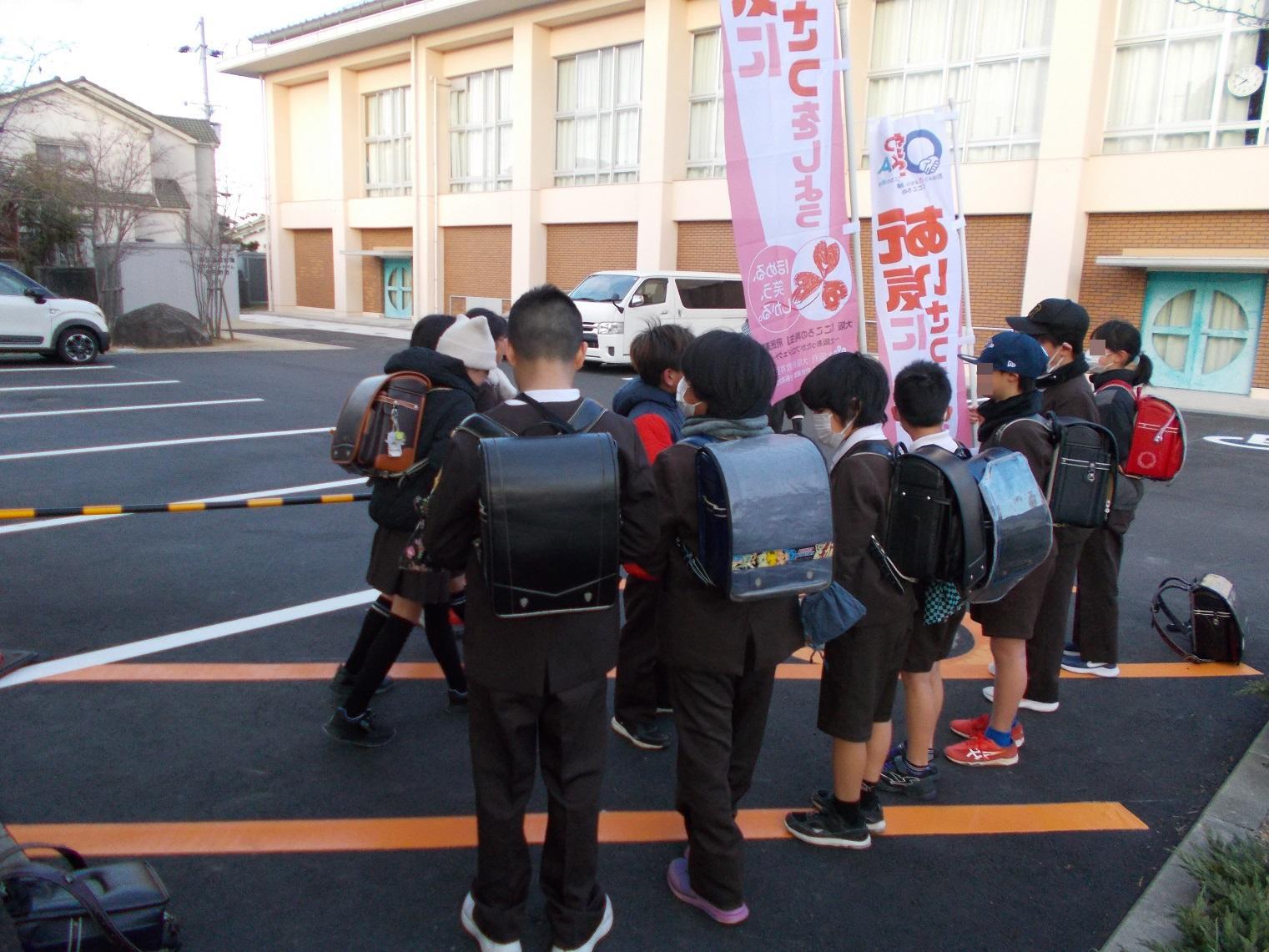 正門と裏門の二か所に分かれて実施しています。元気のいい声が学校付近にもこだましています。高学年としてのリーダーシップをしっかり発揮できています。頼もしい!!