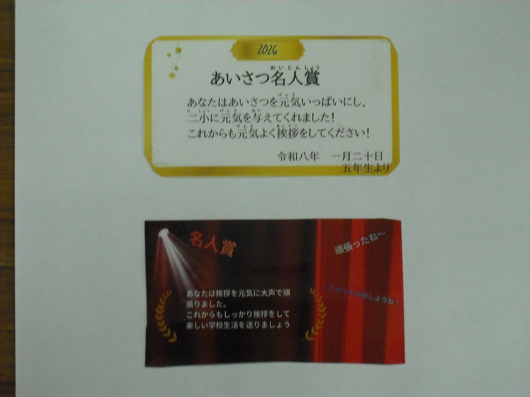 元気よく挨拶できた児童へ「あいさつ名人賞」カードを配布しています。上段は1/20分、下段は1/21配布分です。1/22はどんなカードになるのかな?楽しみです(*'▽')