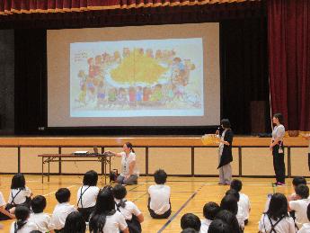 前半は体育館に集まり、担当の先生の進行で「平和集会」をおこないました。校長先生から80年前のこの日に広島で原子爆弾が落とされたことや、世界には今もなお沢山の国や地域が戦いを続けていること、世界中には約1万もの核兵器があるうえに、それが使われる脅威が高まっていることなどの話がありました。そして、子どもであっても、平和な社会の実現に向けて、知って、考えて、行動することが大切だとの話がありました。そして、先生たち全員で絵本「へいわとせんそう」(浜田桂子 作、童心社)を読み聞かせた後、たてわり班内で感想を伝え合いました。