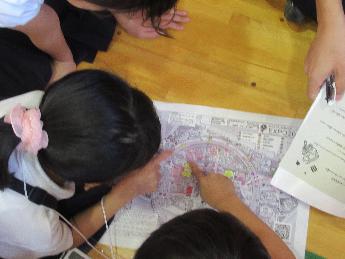 担当の先生から、遠足の目的や注意事項などの説明を受けたあと、たてわり班で分かれて話し合いをしました。特に混雑が予想される万博会場でスムーズに行動できるように、2列での並び方や写真撮影の並び方、地図上での移動コースの確認などを念入りにしていました。