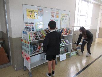 今日の15分休憩、今年度はじめての「出張図書」がありました。これは、学校図書館から一番遠い場所に教室がある4・5・6年生の子どもたちにとって、学校図書館が少しでも身近な存在になるようにと、学校図書館司書が選りすぐりの図書をブックトラック2台に満載して、教室前の廊下に「出張」することです。