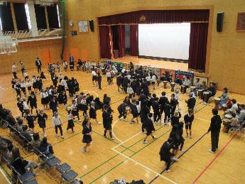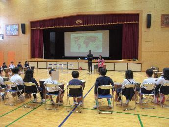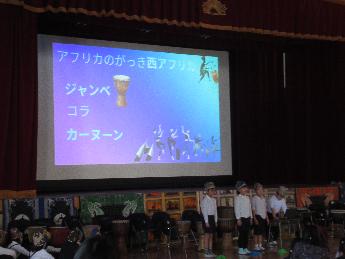 今日は、2年生の「アフリカの音楽体験」発表会のため、全児童と2年生の保護者、そしていつも見守ってくださる地域の皆さまに体育館に集まっていただきました。