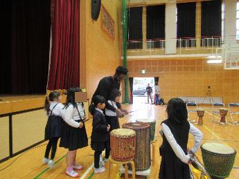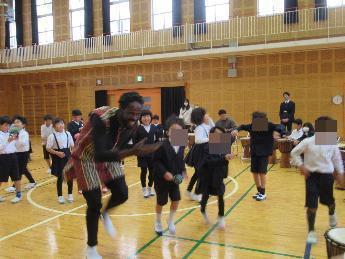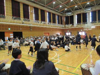 顔や腕などにペイントをした2年生の子どもたちも、沢山の観客を前にして緊張した様子でしたが、メイサ先生のリズムに合わせたジェンベの演奏が始まると笑顔が戻ってきました。途中からジェンベの演奏を他の学年の子どもたちに任せ、2年生はマラカスなどを持ってダンスを。次第にダンスの輪が広がっていき、最後は保護者と地域の方たちが叩くジェンベに合わせて子どもたちが輪になってダンスをしました。体育館中に皆の笑顔が広がった、とても素晴らしい時間でした。