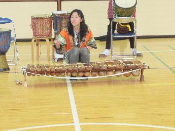 前回の復習として、一人一つの太鼓(ジェンベ)を叩いてリズムを合わせた後、今日はマラカスなど小さな楽器を持ってダンスをしたり、木琴(ティンビラ)を演奏したりしました。