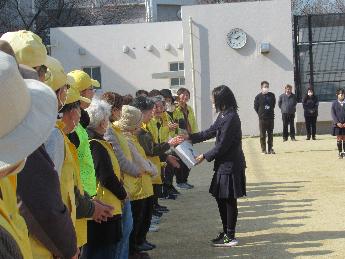 今日は今年度最後の回なので、第三小学校では市内一斉パトロールに先立ち「ありがとう集会」をおこないました。運動場に集まってくださった見守り活動をしてくださっている地域の方々のことをよく知るために、見守り隊の活動に関するクイズ大会をおこなったあと、児童代表からお礼の気持ちを言葉と手紙で伝えました。