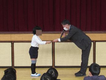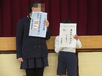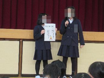 校長先生からパラリンピックに関するお話があった後、児童会から生活目標「廊下や階段は右側を歩こう」「移動教室は静かに移動しよう」、給食保健委員会から給食目標「一年間の給食を振り返ってみよう」と保健目標「耳を大切にしよう」の発表、そして読書通帳と書道コンクールの表彰がありました。最後は、保健室の先生から、生理用品についてのお話がありました。