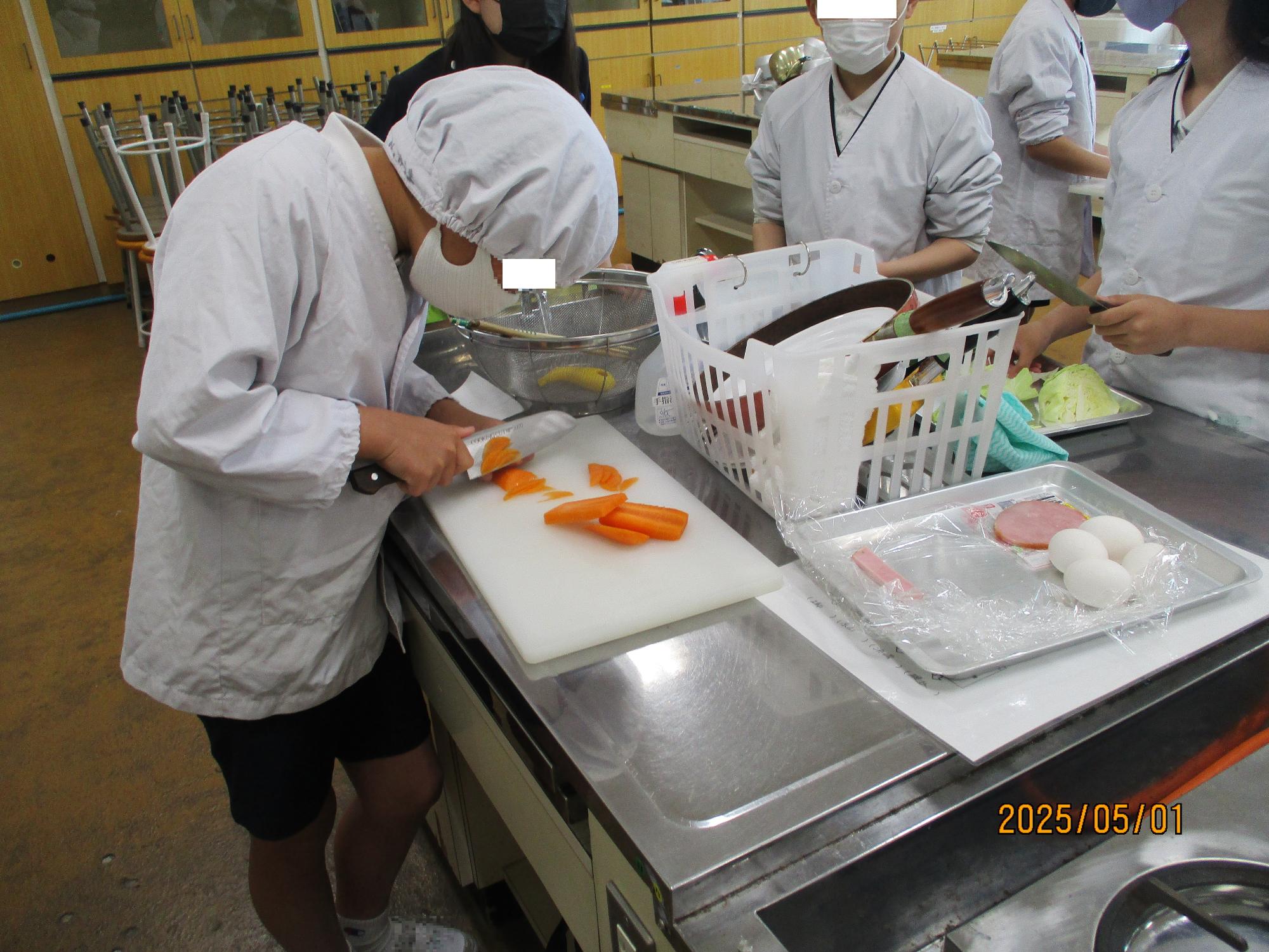 野菜の切り方や炒める順番、火の加減や菜箸の使い分けなど、美味しく・安全に仕上げるためのポイントを学びました。調理は班ごとに行い、役割分担をして取り組みました。
