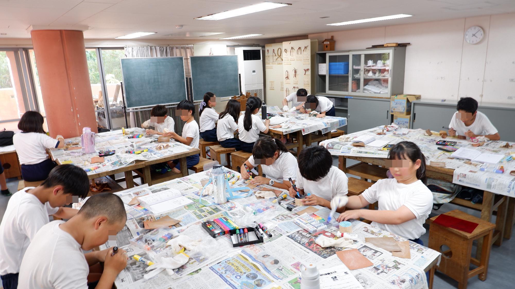 その後、クラフト室をお借りして丸太切りとスライスチップ作り体験をしました。好みのイラストを描いて、自分だけのスライスチップを作りました。