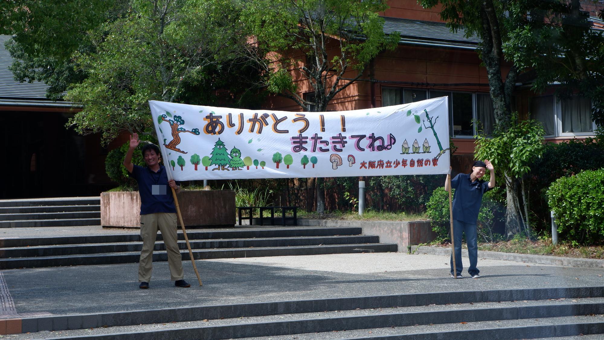 すてきな旗を用いて、施設の方がお見送りしてくれました。楽しい思い出がたくさんできましたね!