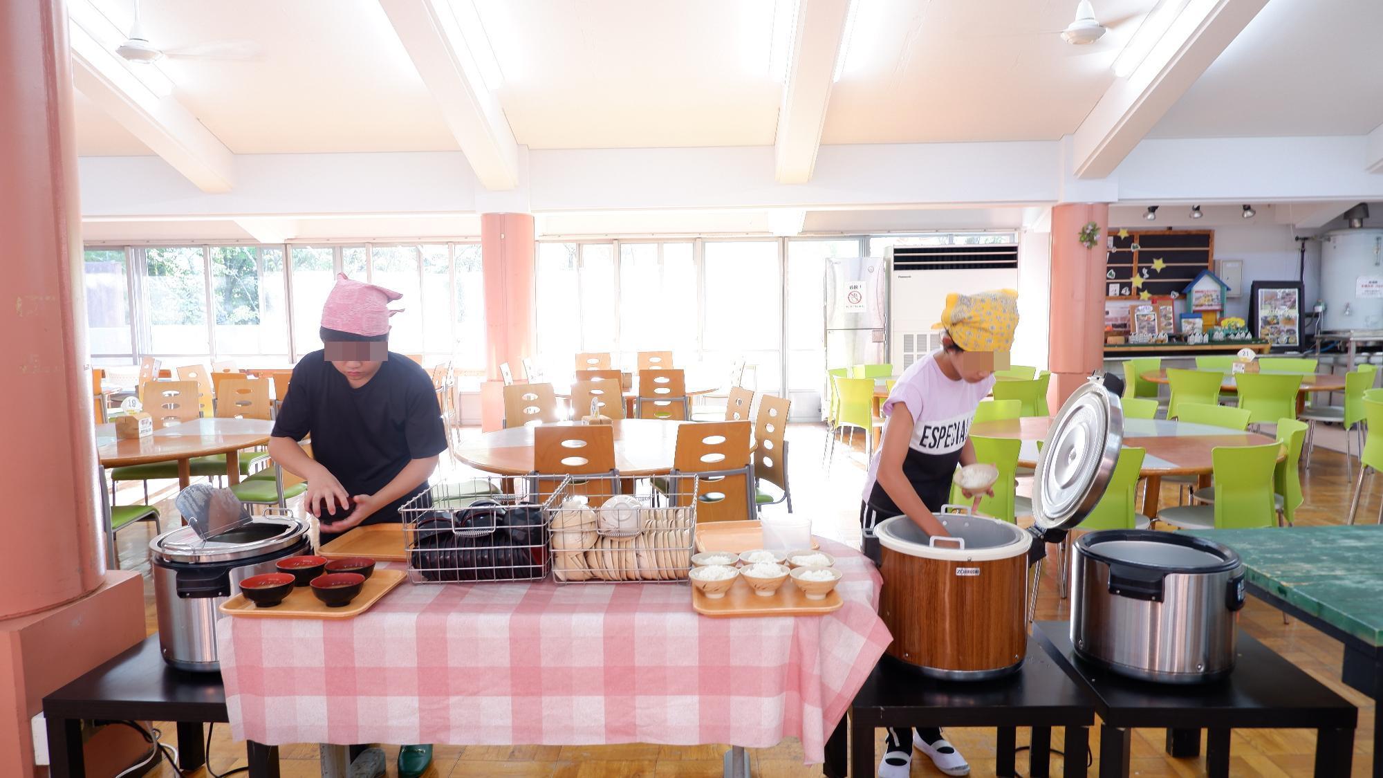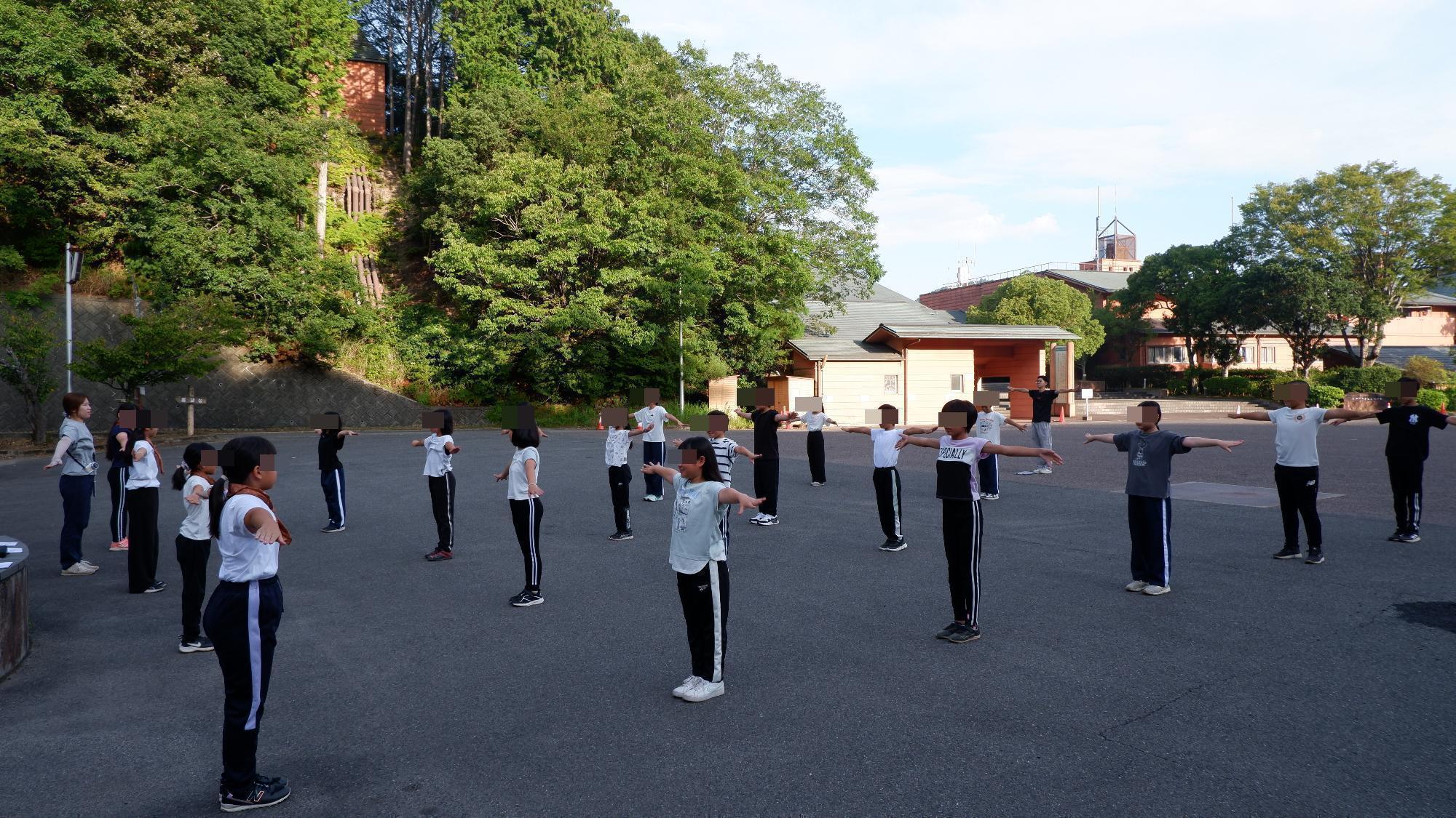 林間学校の2日目は朝の7時にはみんなで集まり、ラジオ体操をしました。朝ごはんは用意していただいた食事を、食事係さんの「いただきます」のあいさつでみんなでおいしくいただきました。