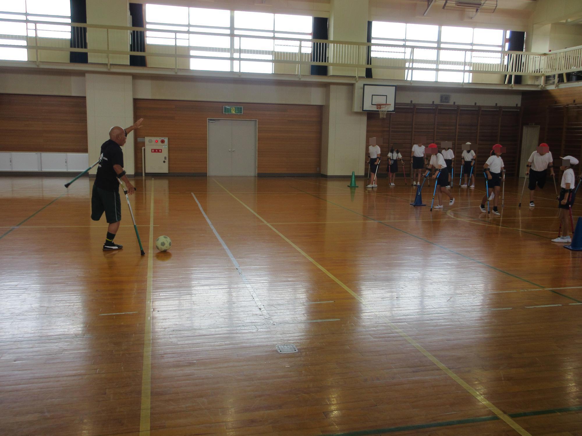 2~4時間にかけて、社会福祉協議会のみなさんと静岡の「ガネーシャ」というアンプティサッカーチームに所属されている川合裕人さんにご来校いただき、5・6年生を対象にアンプティサッカー体験を行いました。