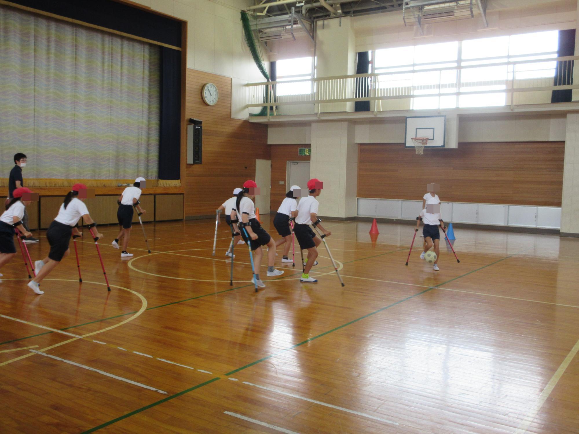 3時間目には5年生が、4時間目には6年生が、川合さんの指導の下で実際にアンプティサッカーを体験しました。クラッチという杖で体を支え、片足を上げながらプレーをしました。慣れない状況に子どもたちは苦戦しながらも、楽しんでプレーをしていました。