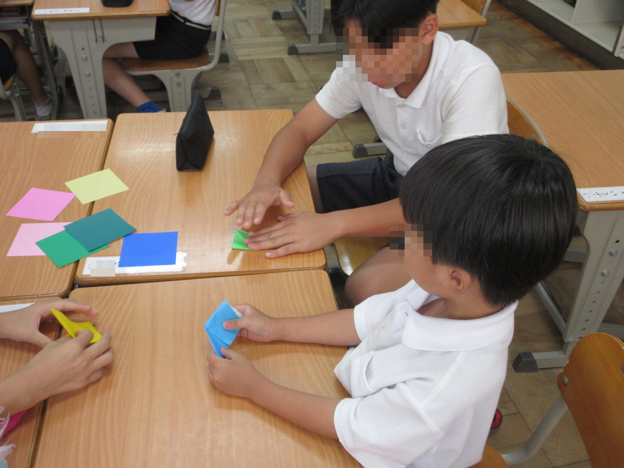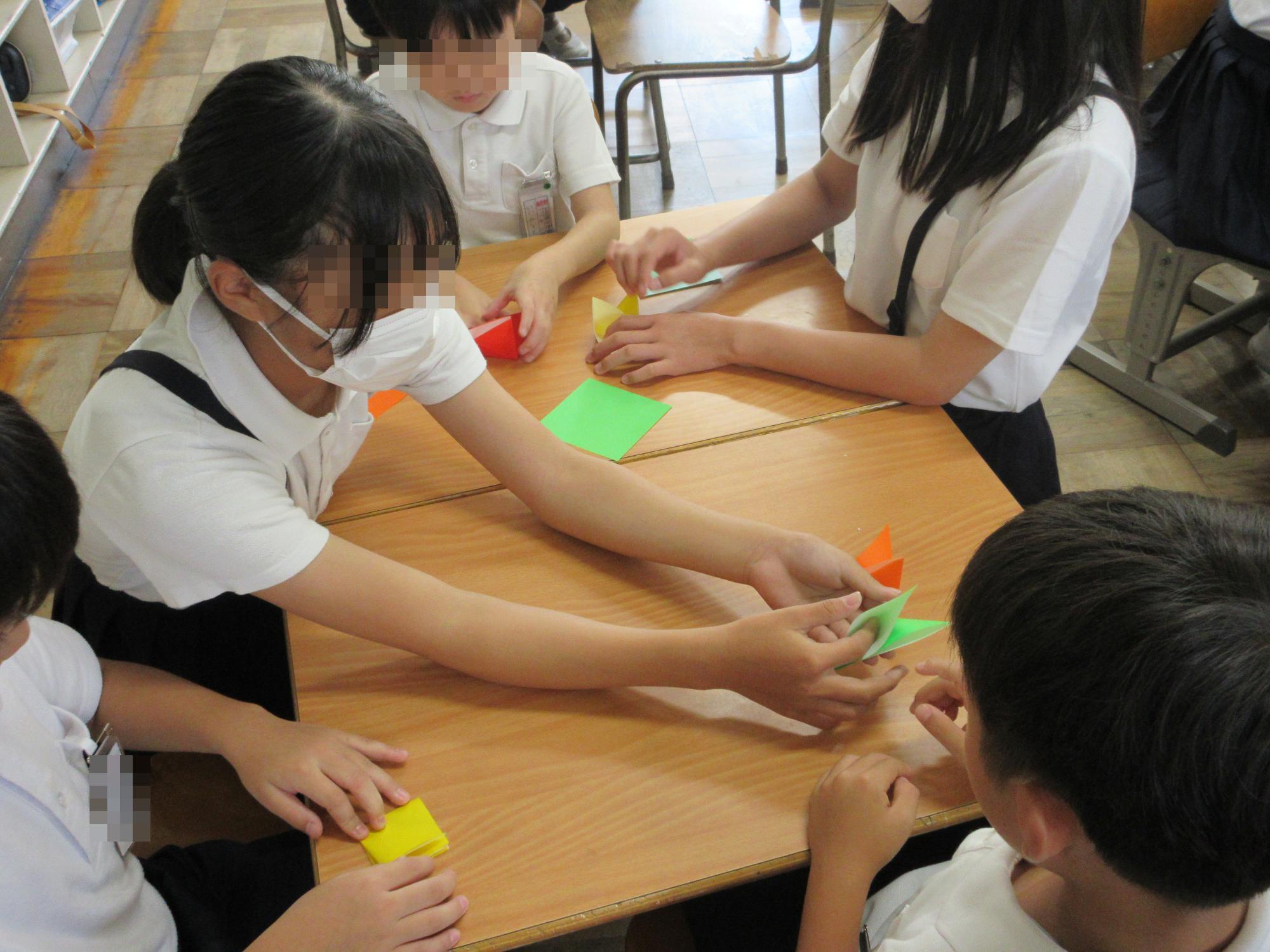土曜授業の2時間目に、にこにこ集会を行いました。1~6年のたてわり班で、6年生が広島への修学旅行に持っていく折り鶴を折りました。6年生が中心になって低学年に折り方を教えたり、折れない部分を手伝いしたりする姿が見られました。平和への願いを込めて全校児童で丁寧に折ることができました。