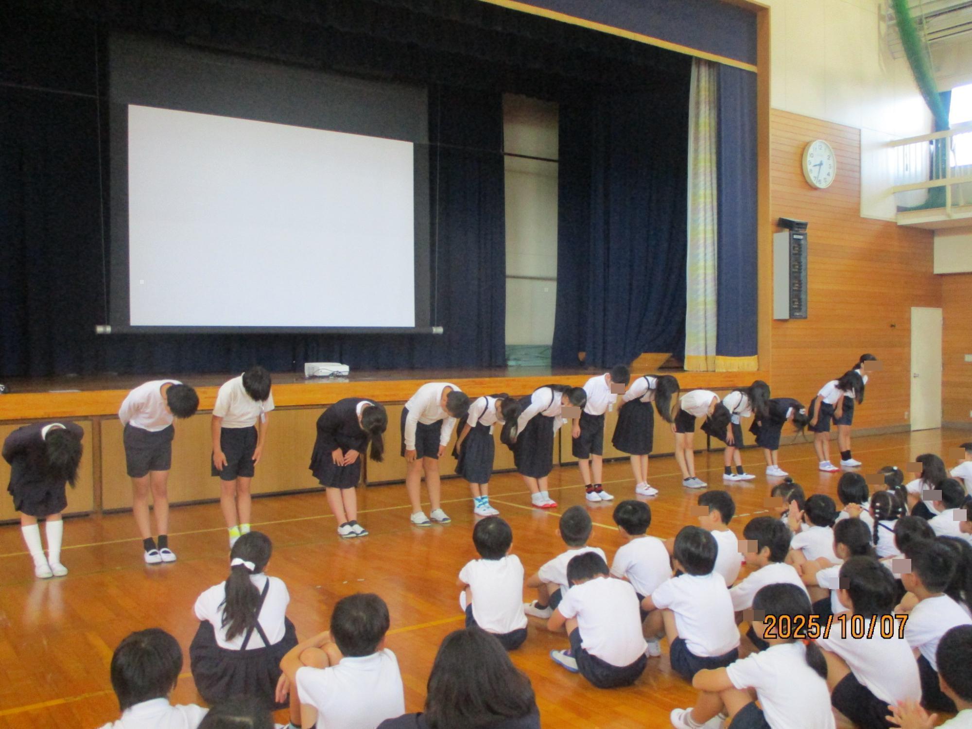 最後に生徒指導の先生より、児童朝会での聞く姿勢についてのお話や、日頃の過ごし方の良いところと改善できるところについてお話がありました。
