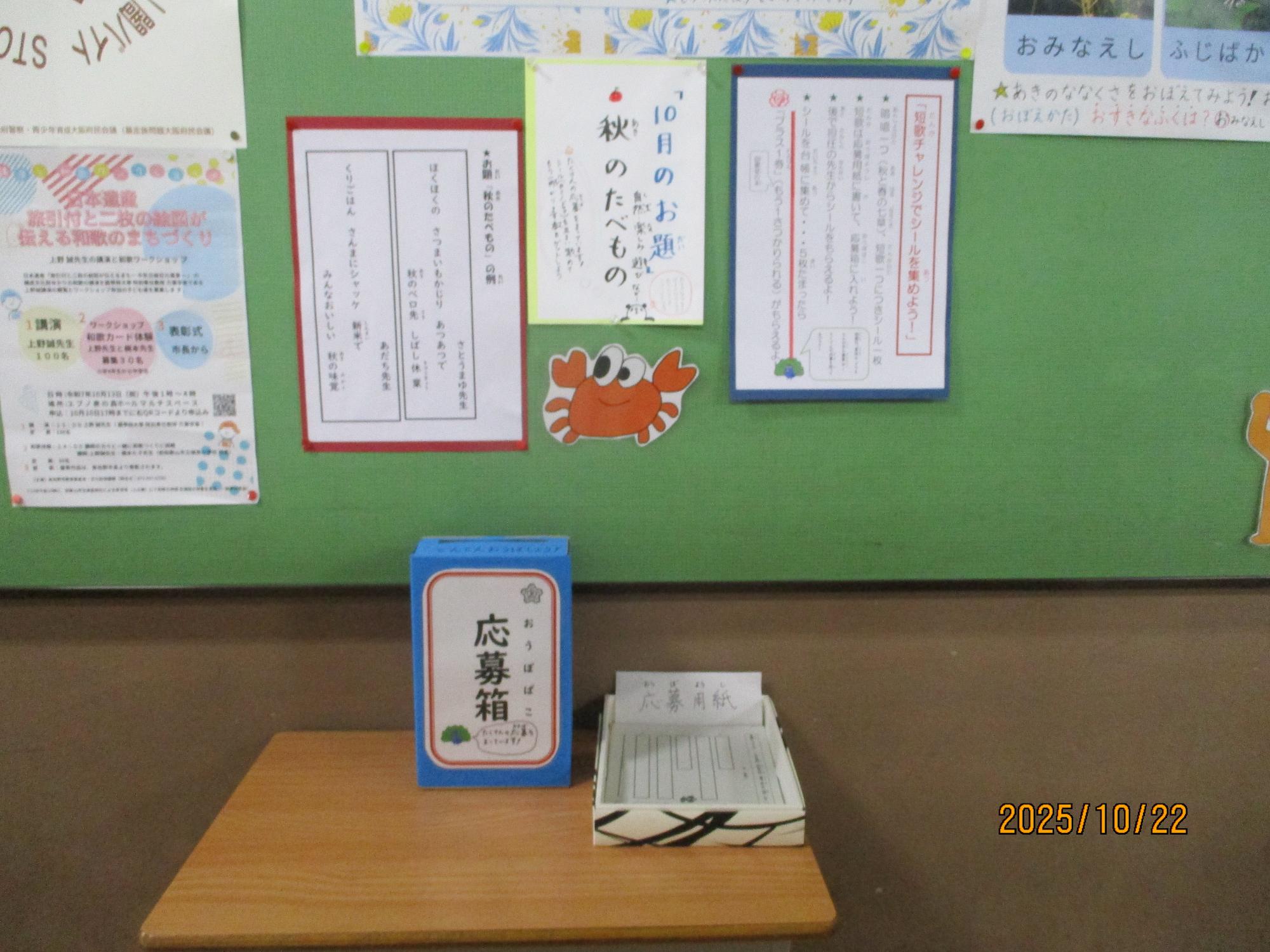 校長室前にお題と応募箱を用意しています。先生が考えた短歌も掲載しています!
