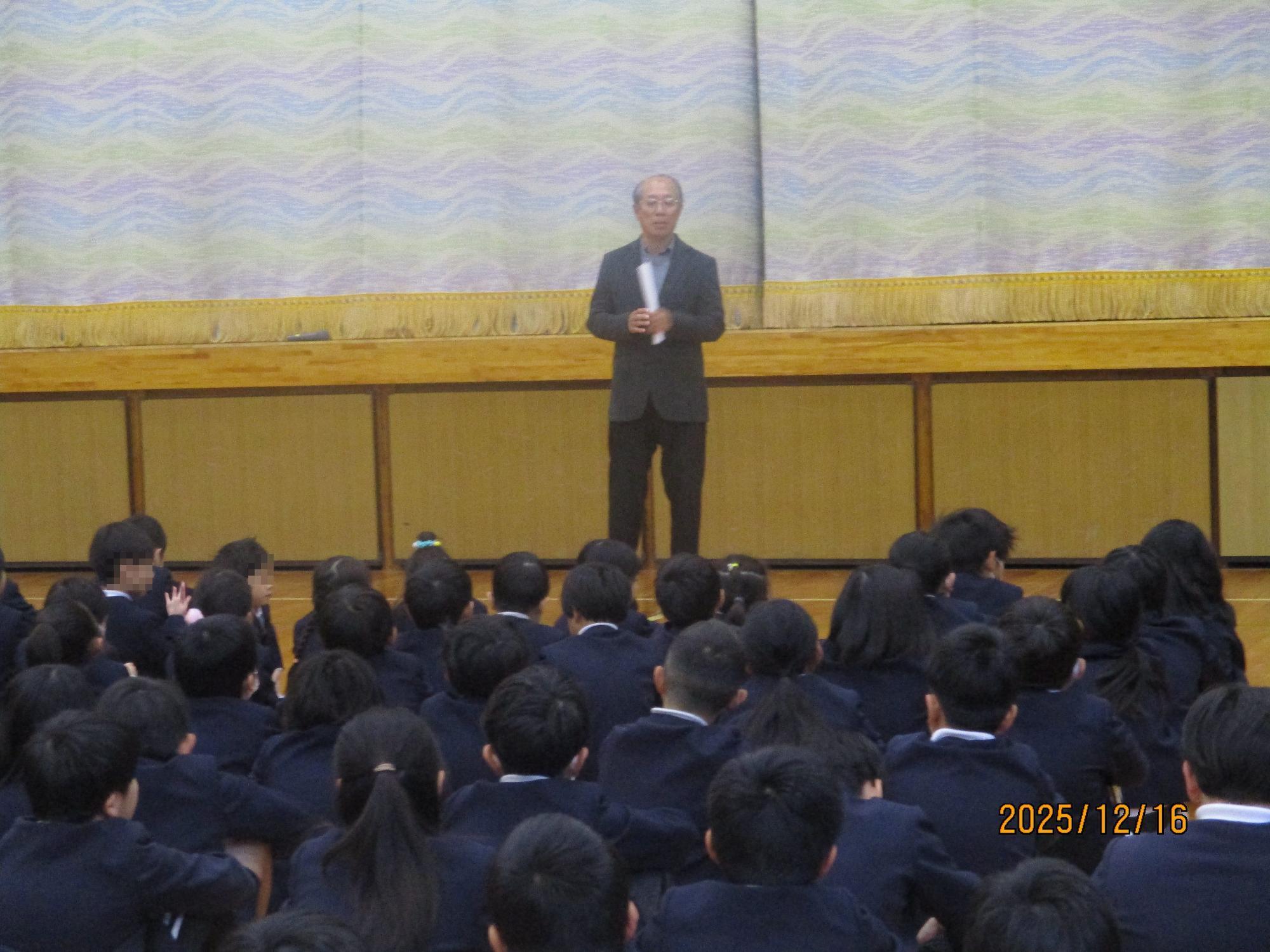 児童朝会で、生徒指導機能充実に係る支援員(警察OB)の田中さんに、「SNSに関するトラブルの防止」についてのお話をしていただきました。