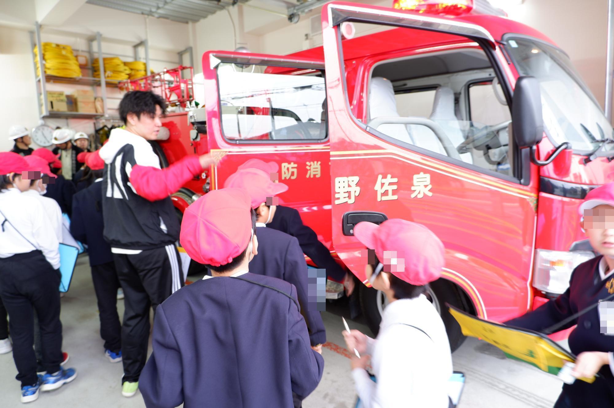 3時間目に3年生がコミュニティセンター横に設置されている泉佐野市消防団上之郷分団へ社会見学に行ってきました。