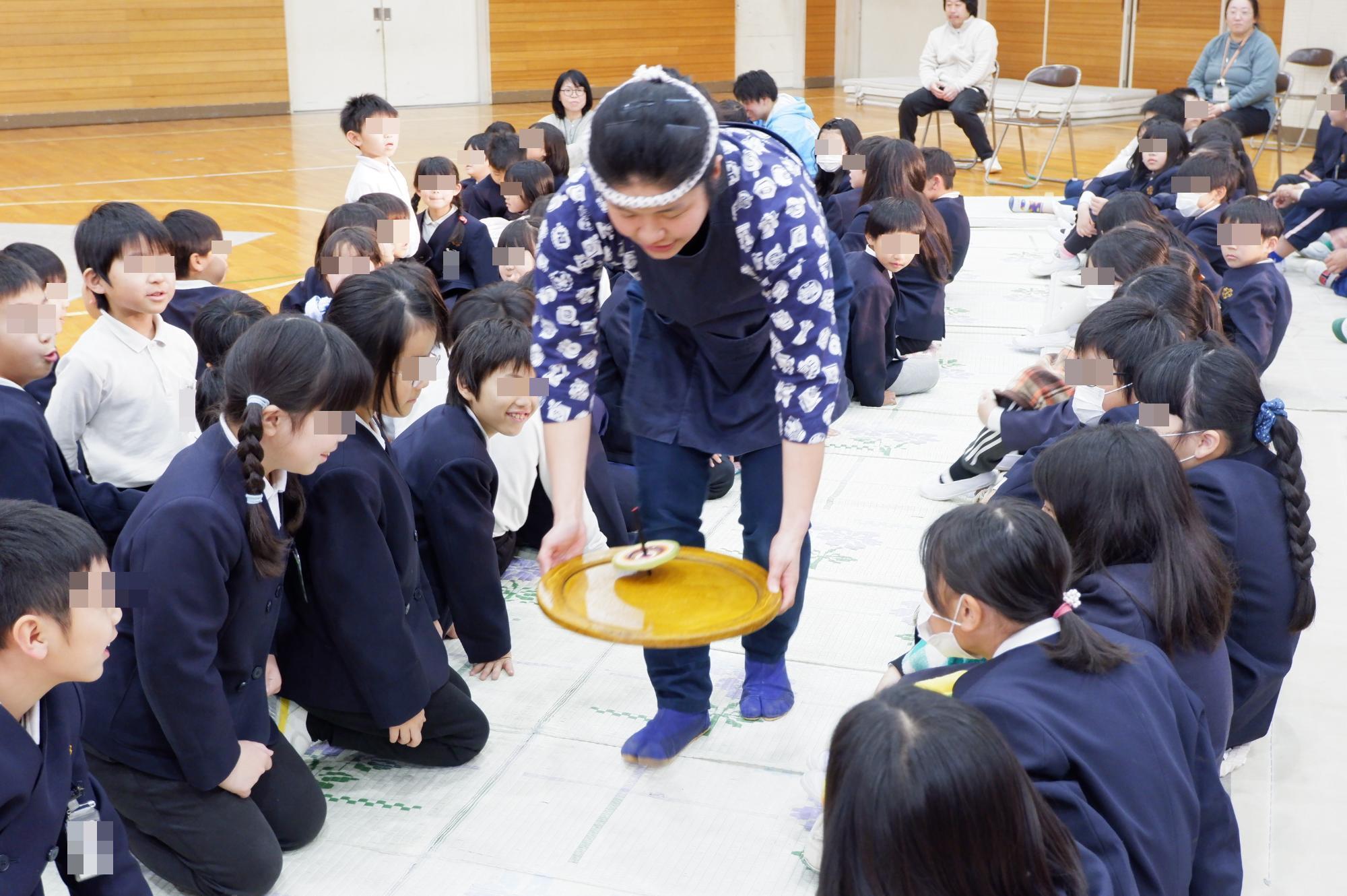京都で唄われ続けたわらべ歌に合わせて、おてだまやけん玉、紙ふうせんなどの懐かしい遊びを続々と披露していただき、子どもたちは大喜びでした。子どもも教職員も楽しく心に残る時間になりました。