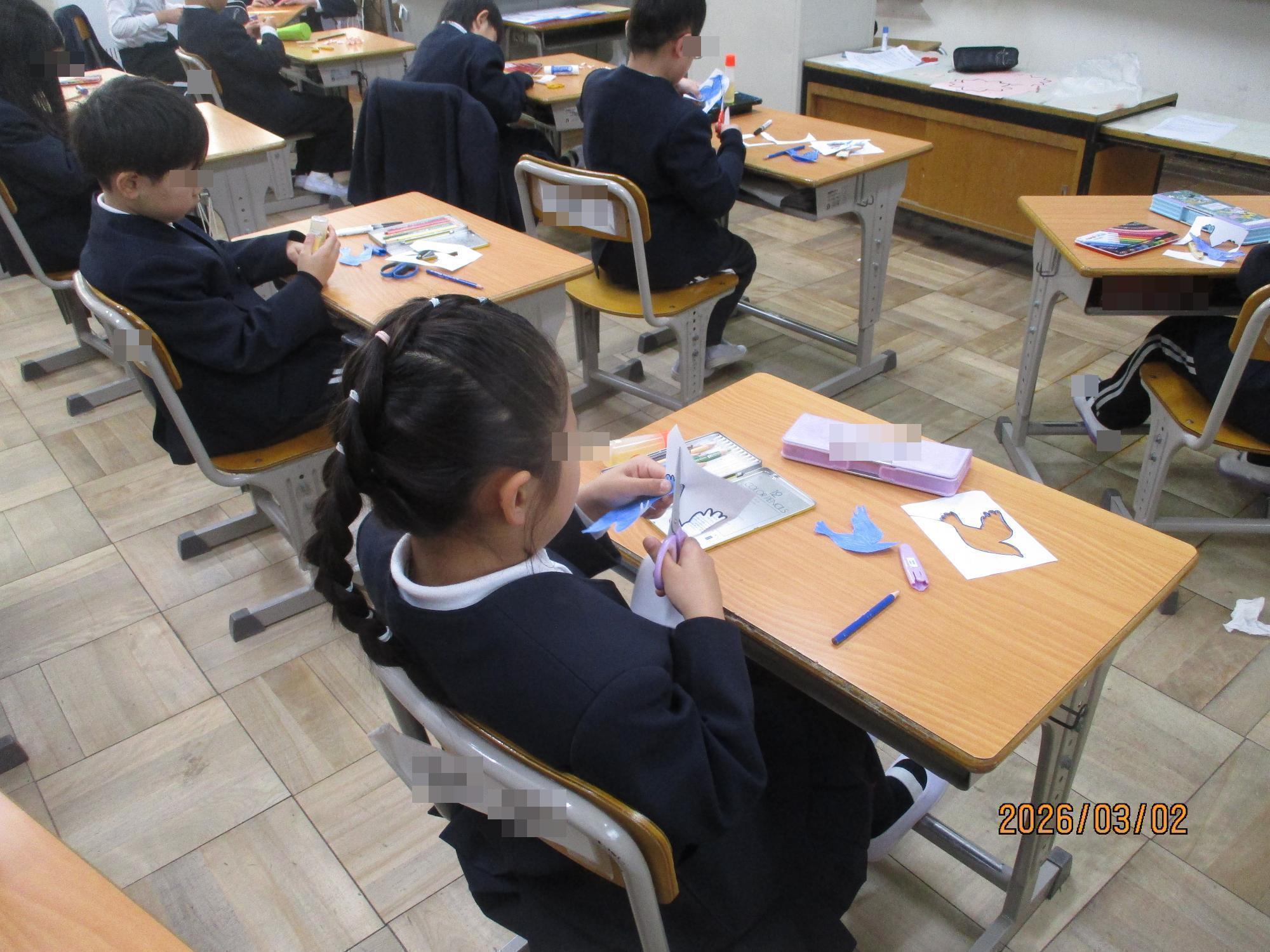今回も1から6年生が7つの班に分かれて交流を行いました。始めに、にこにこ集会の活動を1年間振り返って、楽しかったことや反省点を出し合いました。また、今年度のにこにこ集会で中心になって頑張ってくれた班長・副班長さんから挨拶がありました。その後、卒業の際に掲示する飾りをみんなで作成しました。6年生は、小学校でがんばったことや、中学校に向けて頑張りたいことを花の形をした紙に書きました。