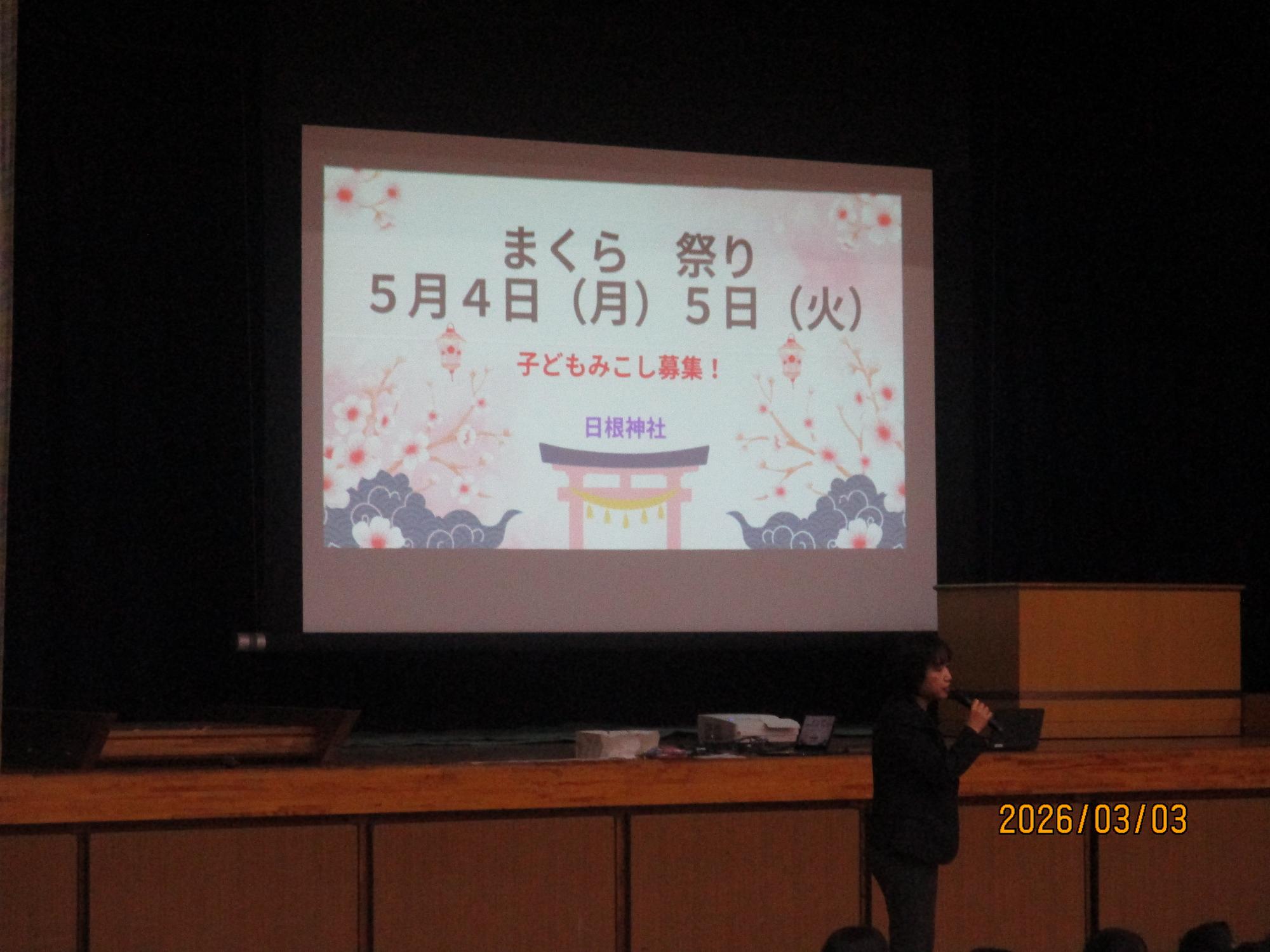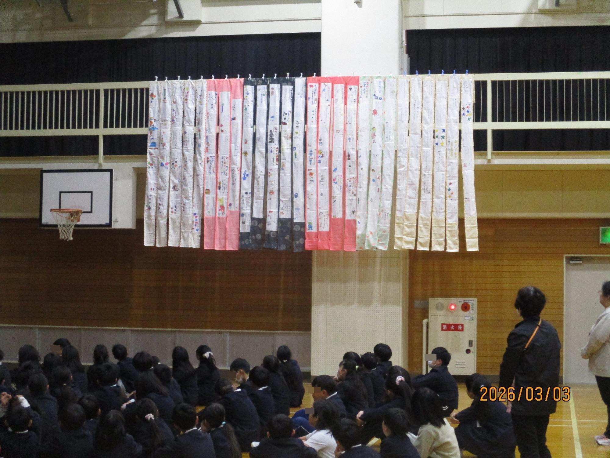 児童朝会の時に校長先生から、今年の5月に実施するまくら祭りの紹介がありました。まくら祭りとは、太い竹の棒につけた25個のまくらを、五社音頭を歌いながら上之郷・日根野・長滝を練り歩くお祭りです。毎年実施しており、上之郷・日根野・長滝の3地区が3年に1回の当番をまわしています。今年は上之郷の当番だそうです。併せて、まくらの上部につけるのぼりとして、子どもたちが事前に夢や願い事を書いた白い布を地域の方が華やかな布につなぎあわせてくれました。