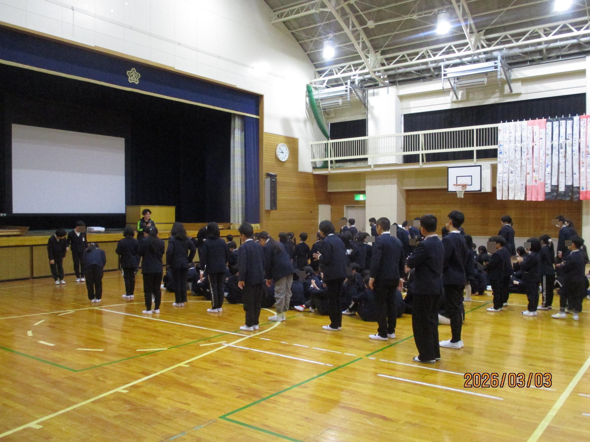 その後、先日実施した体育集会(大なわ大会)の表彰を実施しました。大会当日に跳んだ2回の合計回数で、1位は5年1組で722回、2位は6年1組で503回、3位は1年1組で494回でした。お家でほめてあげてくださいね。惜しくも表彰とならなかった学年は来年度がんばって下さいね。