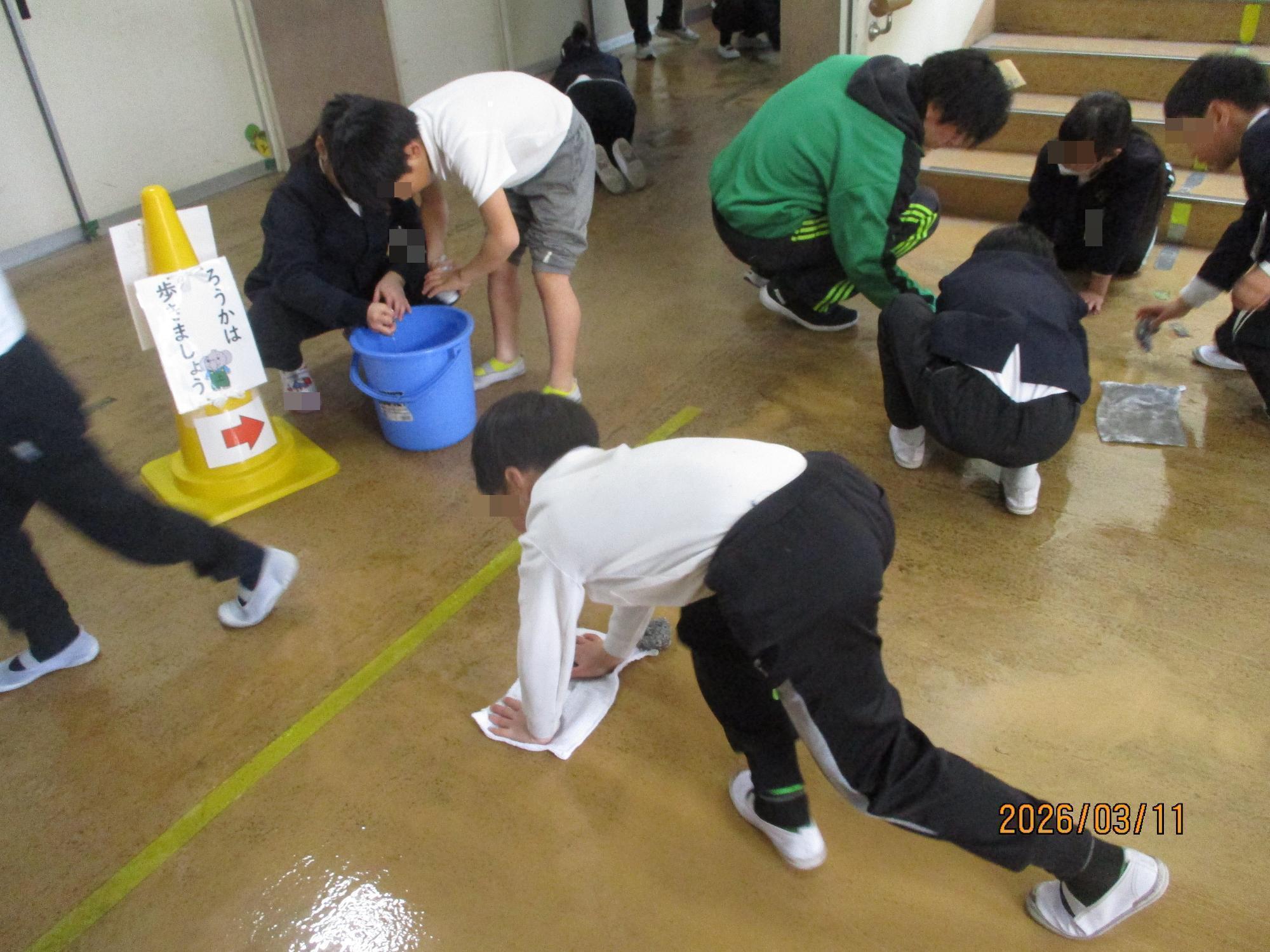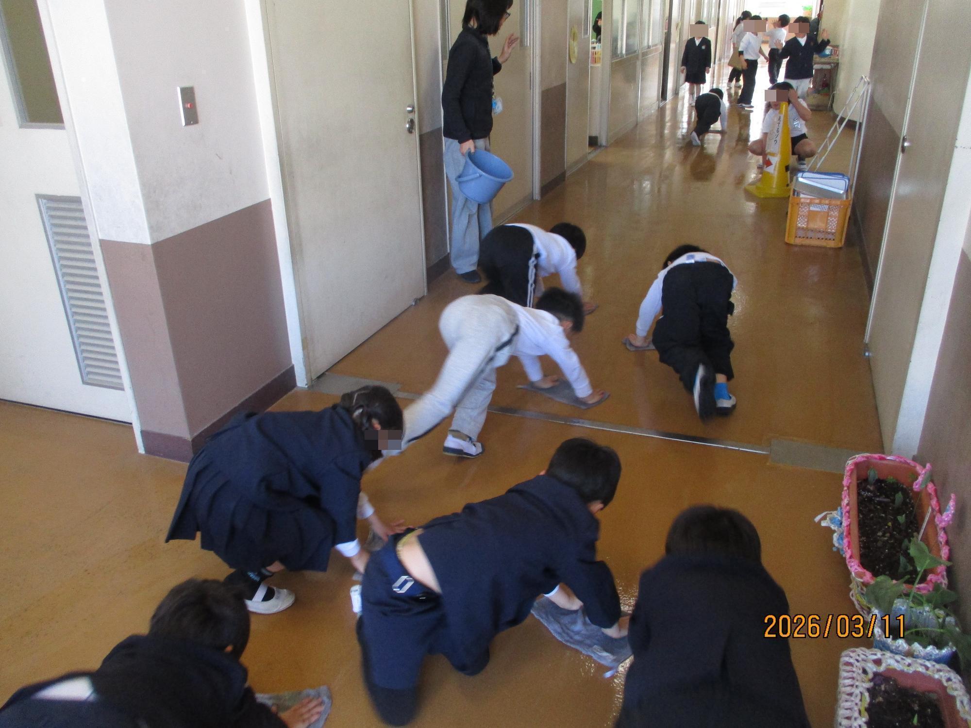 いつもの掃除では使用していないお掃除グッズを使用して、全校児童が協力して学校中をきれいにお掃除してくれました。クラスの教室前だけでなく、階段や保健室前、児童玄関なども丁寧に掃除してくれました。一年間の汚れを落とし、次の学年への準備をします。