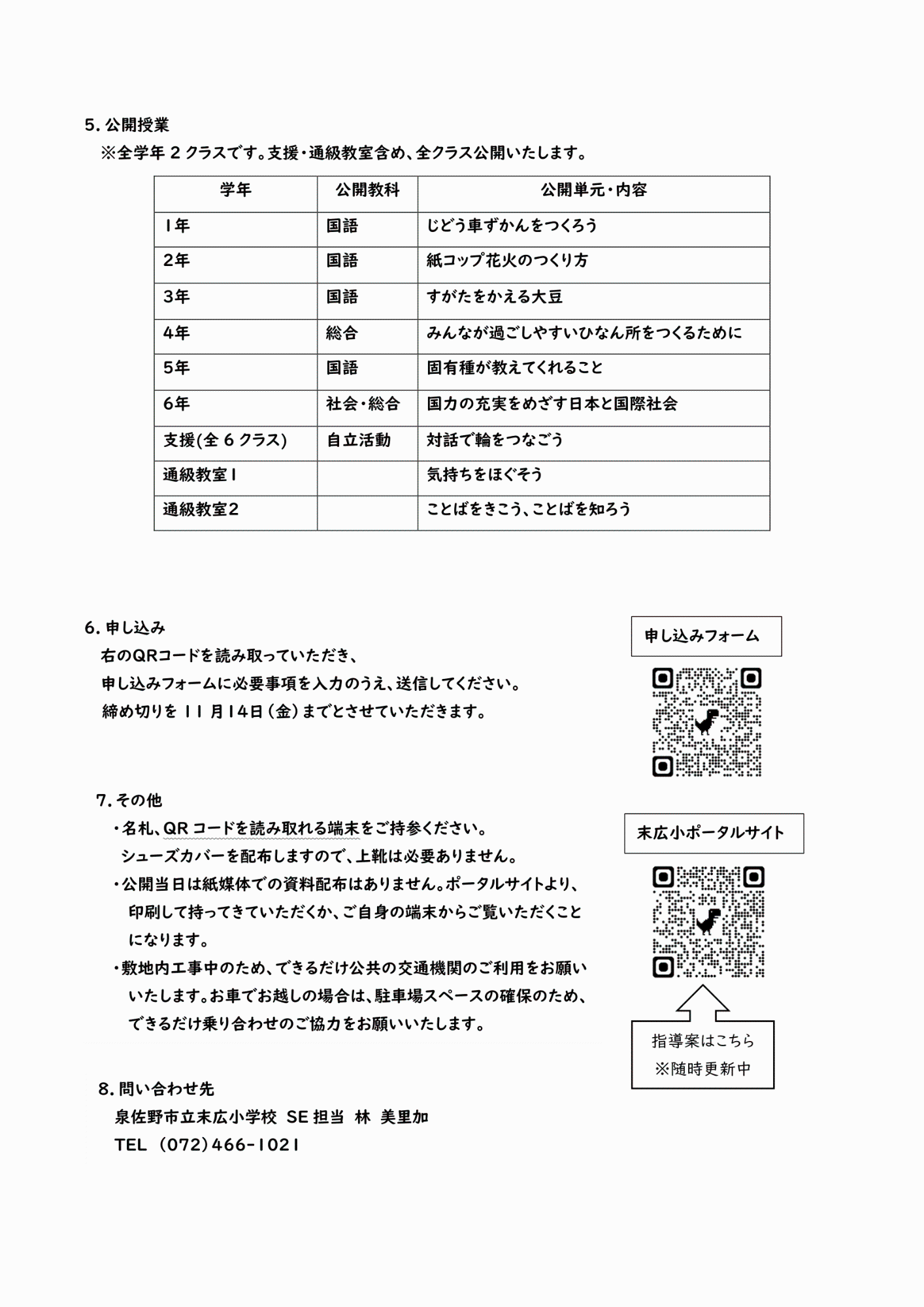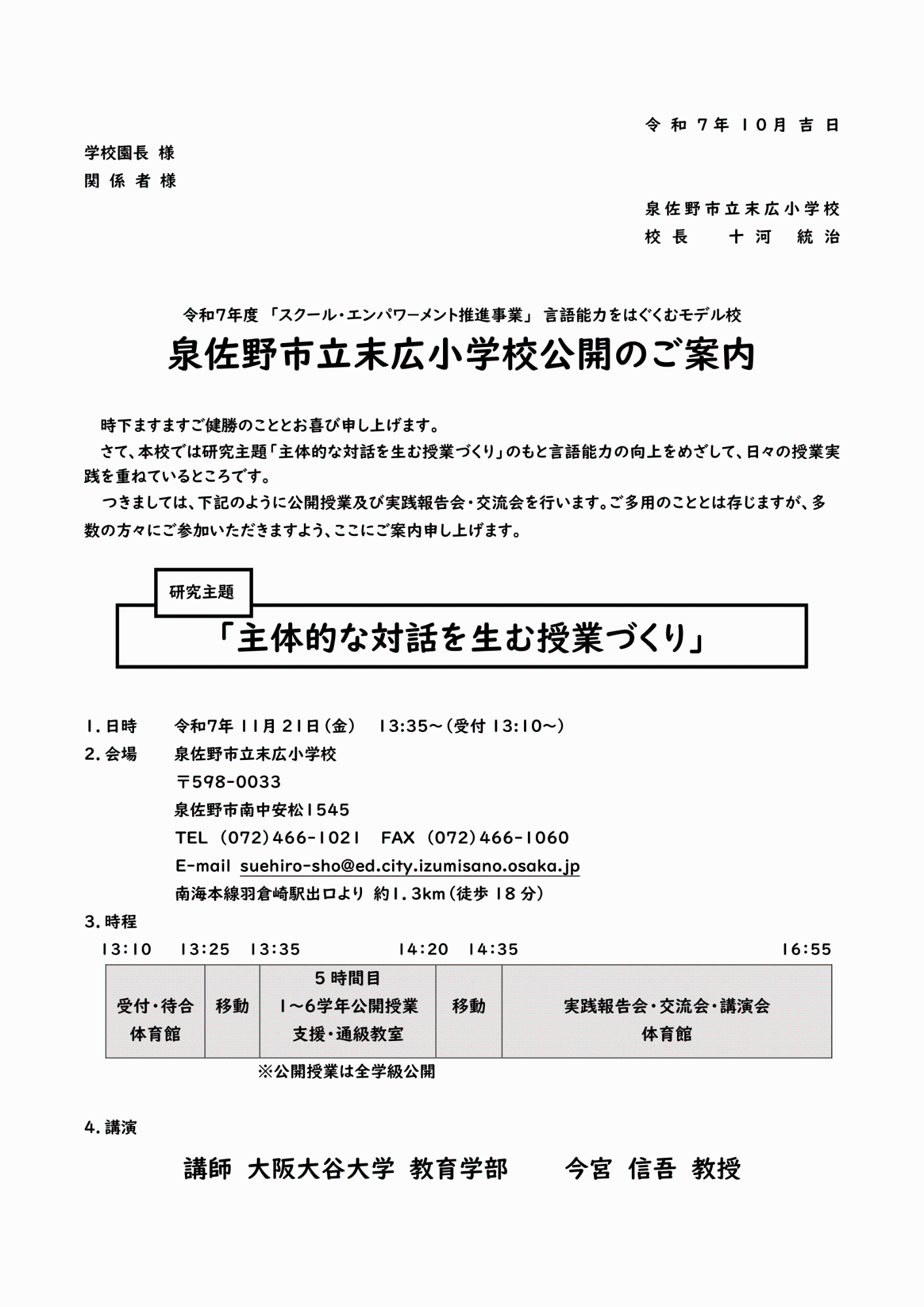 学校公開情報 Tweet 更新日:2025年10月16日 SE学校公開の案内を開始しました この学校公開は、府下全域の教職員を対象にしたものです。 保護者の方、地域の方は参観できません。ご了承くださいますようお願いいたします。 申し込みはこちらフォームからお願いします。 ←クリックしてください 当日の指導案などの資料はこちらポータルサイトから ←クリックしてください