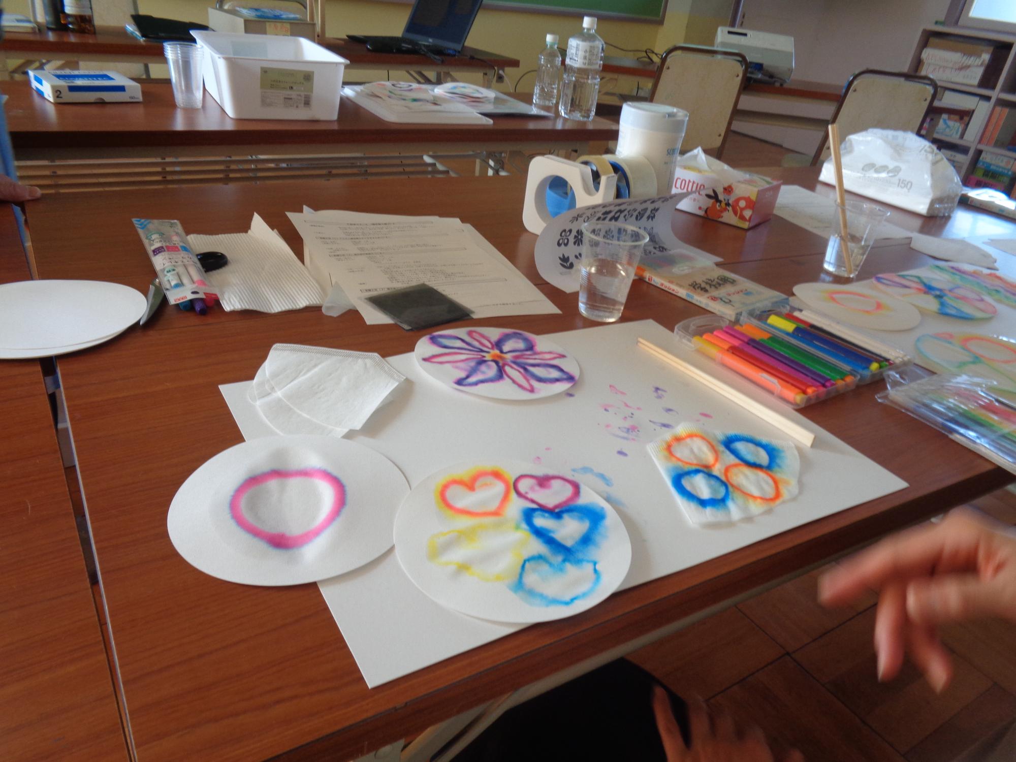 「消える水」や「あるく鉄球」などマジック(手品)のようなミニミニサイエンスショーのあと、偏光板を使った簡単ステンドグラス作りやペーパークロマトグラフィーの原理を使ったきれいな模様柄の工作をしました。